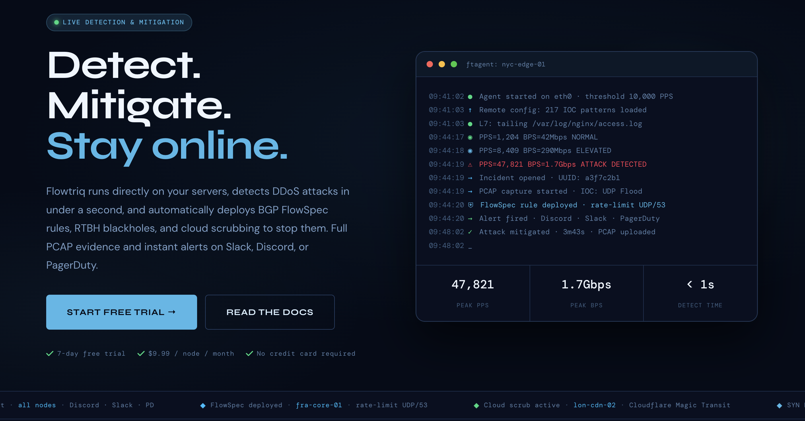 By the time sampled NetFlow tells you there's a DDoS, minutes have passed and customers are already in your inbox. Flowtriq installs in two minutes on a server, detects attacks in under a second, and auto-deploys mitigation with full per-incident forensics. In my 15 years advising ops and security teams, that delta ā minutes versus sub-second ā is the difference between a blameless postmortem and a boardroom fire drill.