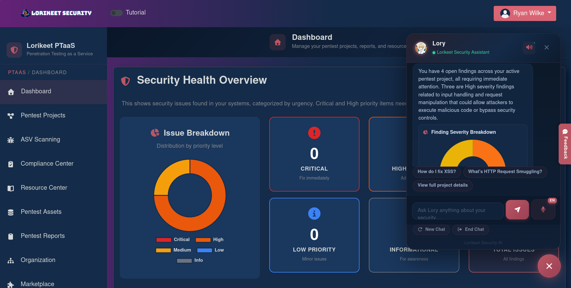 - Lory, the AI Assistant: This isn't a generic chatbot. Lory is trained on nearly 2,000 specific vulnerability entries. You can ask Lory for remediation steps specific to your codebase while the pentest is still active.